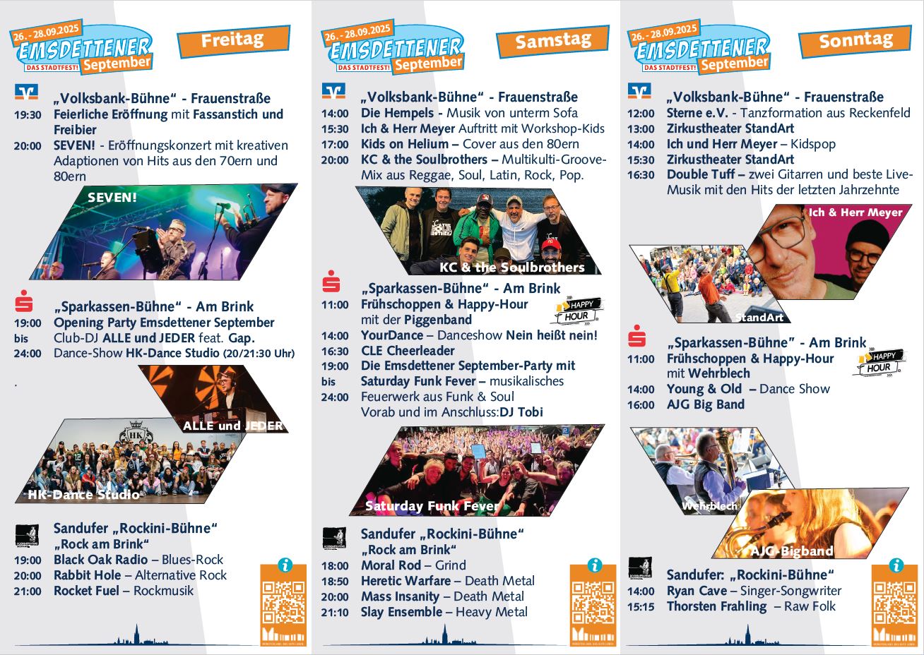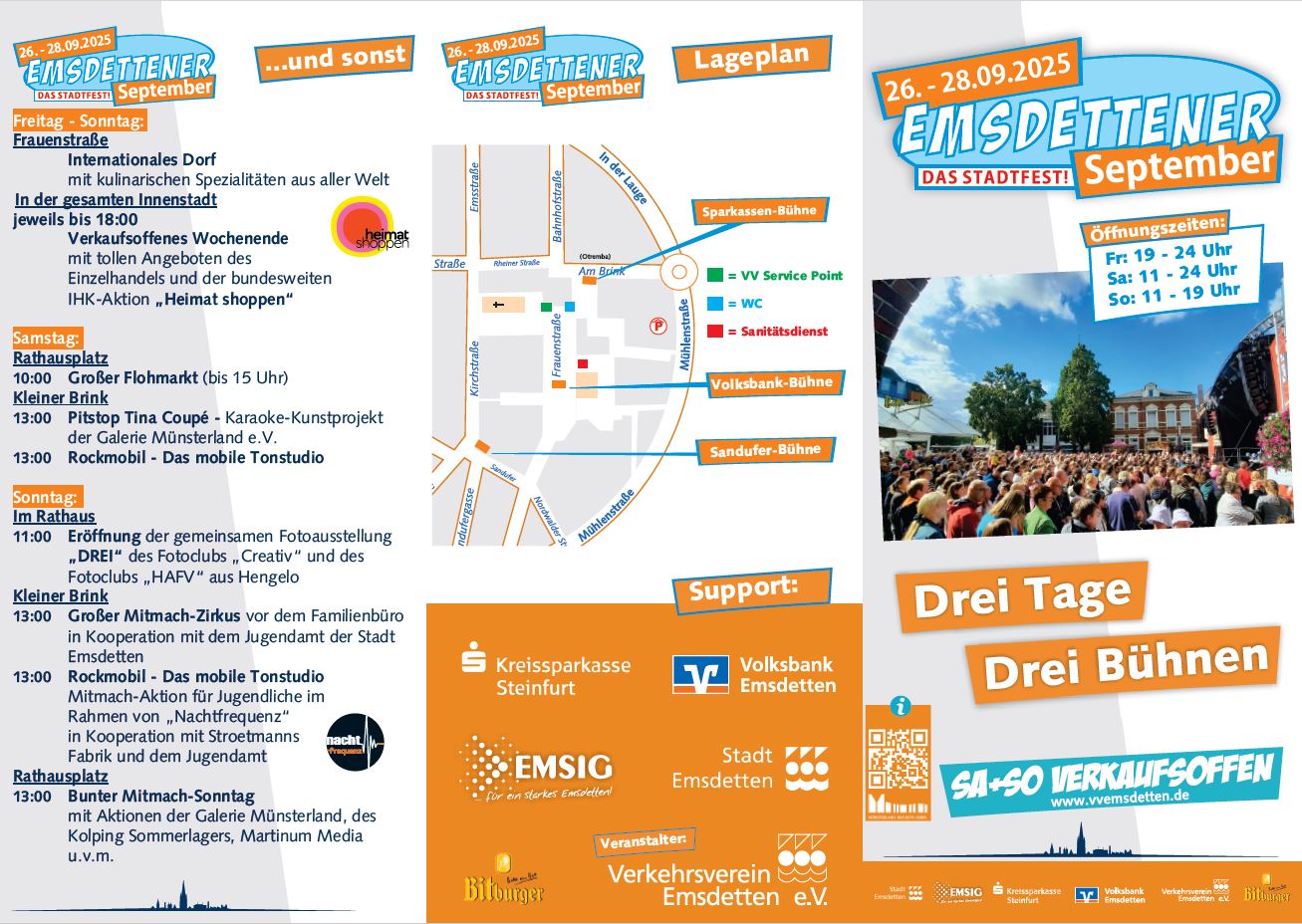 Vom 26. bis 28. September 2025 verwandelt sich die Emsdettener Innenstadt wieder in eine große Open-Air-Bühne und Partymeile: Das Stadtfest „Emsdettener September“ lockt am letzten Septemberwochenende mit jeder Menge Musik und tollen Live-Acts auf drei Bühnen, mit Markttrubel in allen Teilen der Innenstadt, Flohmarkt auf dem Rathausplatz am Samstag, internationalen Spezialitäten, Tanz, Akrobatik und Theater für Kids sowie einem Super-Einkaufs-Wochenende. Drei Tage lang feiern Vereine, Künstler, Emsdettener und Gäste gemeinsam ein einzigartiges Stadtfest, das für jeden etwas bereithält.