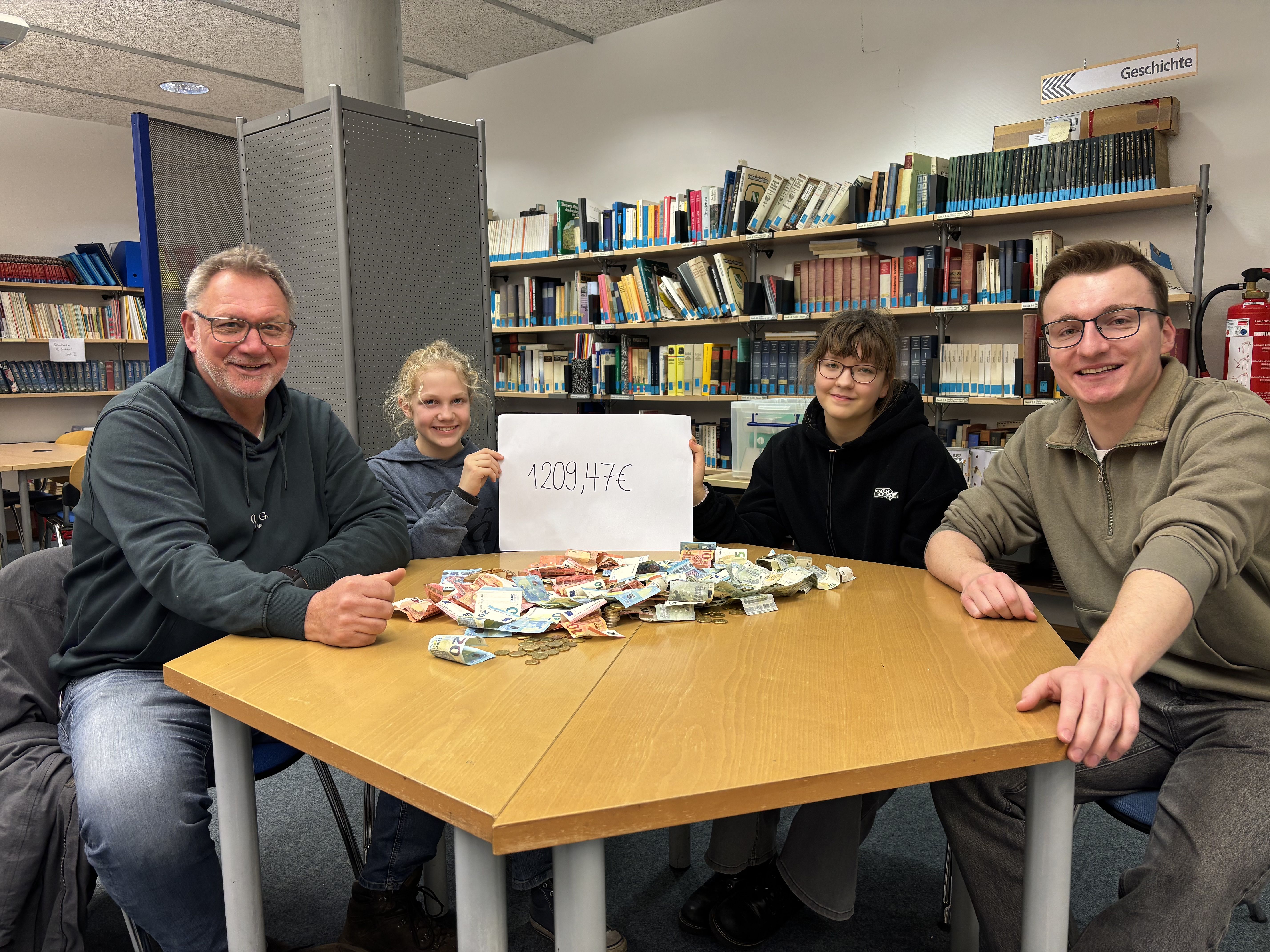 Gemeinsam für den guten Zweck: Ralf Deupmann (NABU), Lenja und Kamilla von der AG Bioptop am Gymnasium Martinum und Luis Hemesath (Verkehrsverein Emsdetten) bei der Auszählung der Spenden.