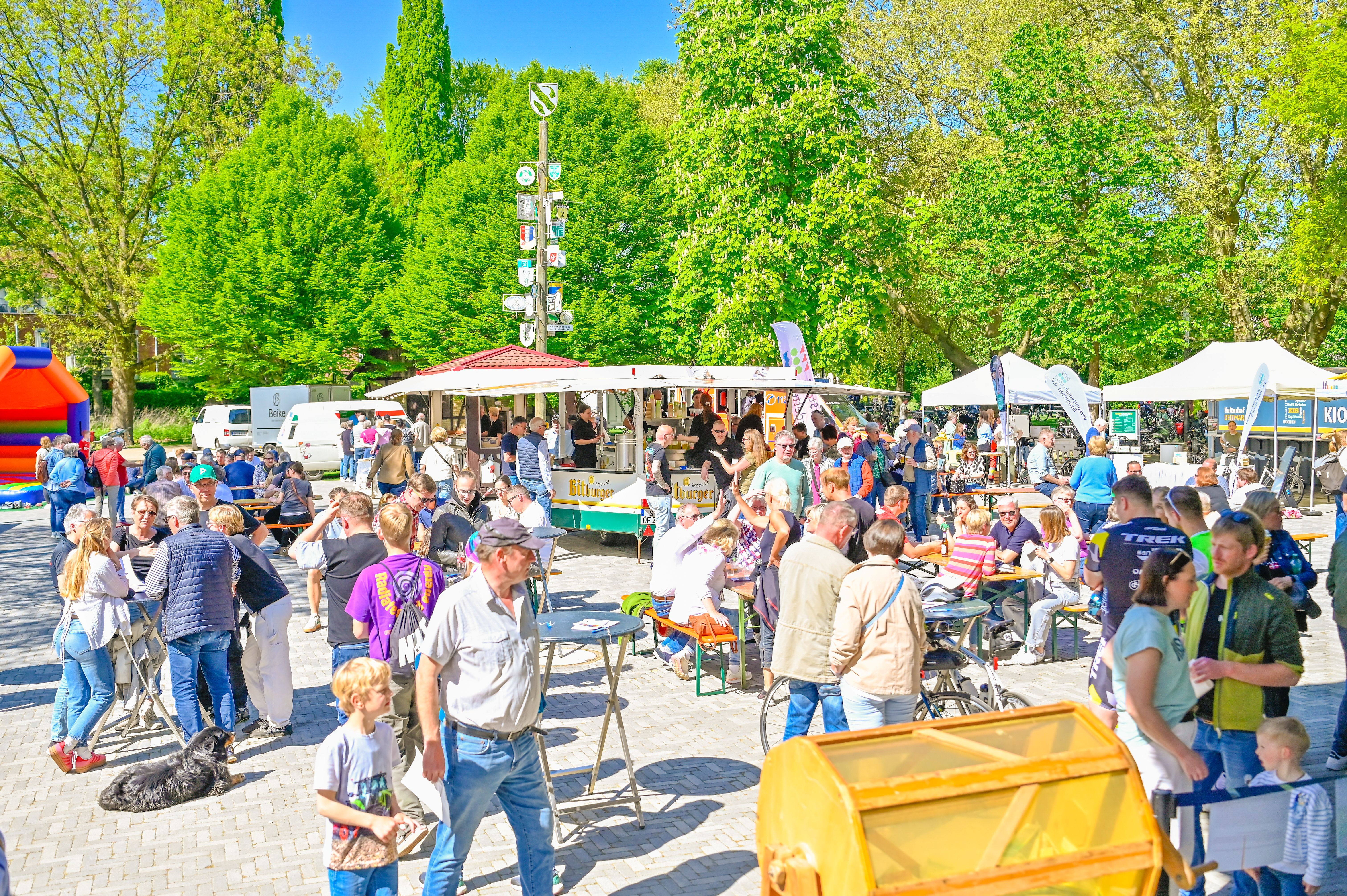 Neben Start- und Zielpunkt erwartet die Besucherinnen und Besucher ein abwechslungsreiches Programm für die ganze Familie im Kulturhof Deitmar. Die Polizei Steinfurt informiert an ihrem Stand rund um das Thema sicheres Radfahren und bringt erneut den beliebten Pedelec-Simulator mit. Die Verkehrswacht ist mit ihrem Infomobil vertreten und bietet weitere Informationen zur Verkehrssicherheit. Unter dem Motto „Erste Hilfe rettet Leben“ laden das UKM Marienhospital und der DRK-Ortsverein Emsdetten zu einer Mitmachaktion ein, bei der Interessierte ihr Wissen zum richtigen Verhalten bei einem plötzlichen Herzstillstand auffrischen können. Auch die Emsdettener Fahrradhändler Marco’s Radwerk, Tippkötter Bikes und Zweirad Homann präsentieren aktuelle Fahrradmodelle und bieten Serviceangebote rund ums Rad an. Zudem informieren die Radwanderfreunde Münsterland sowie der Verkehrsverein Emsdetten über ihre Angebote. Für Kinder sorgt eine Hüpfburg für zusätzlichen Spaß und für das leibliche Wohl sorgen Stroetmanns-Gastroteam und ein Imbisswagen.
