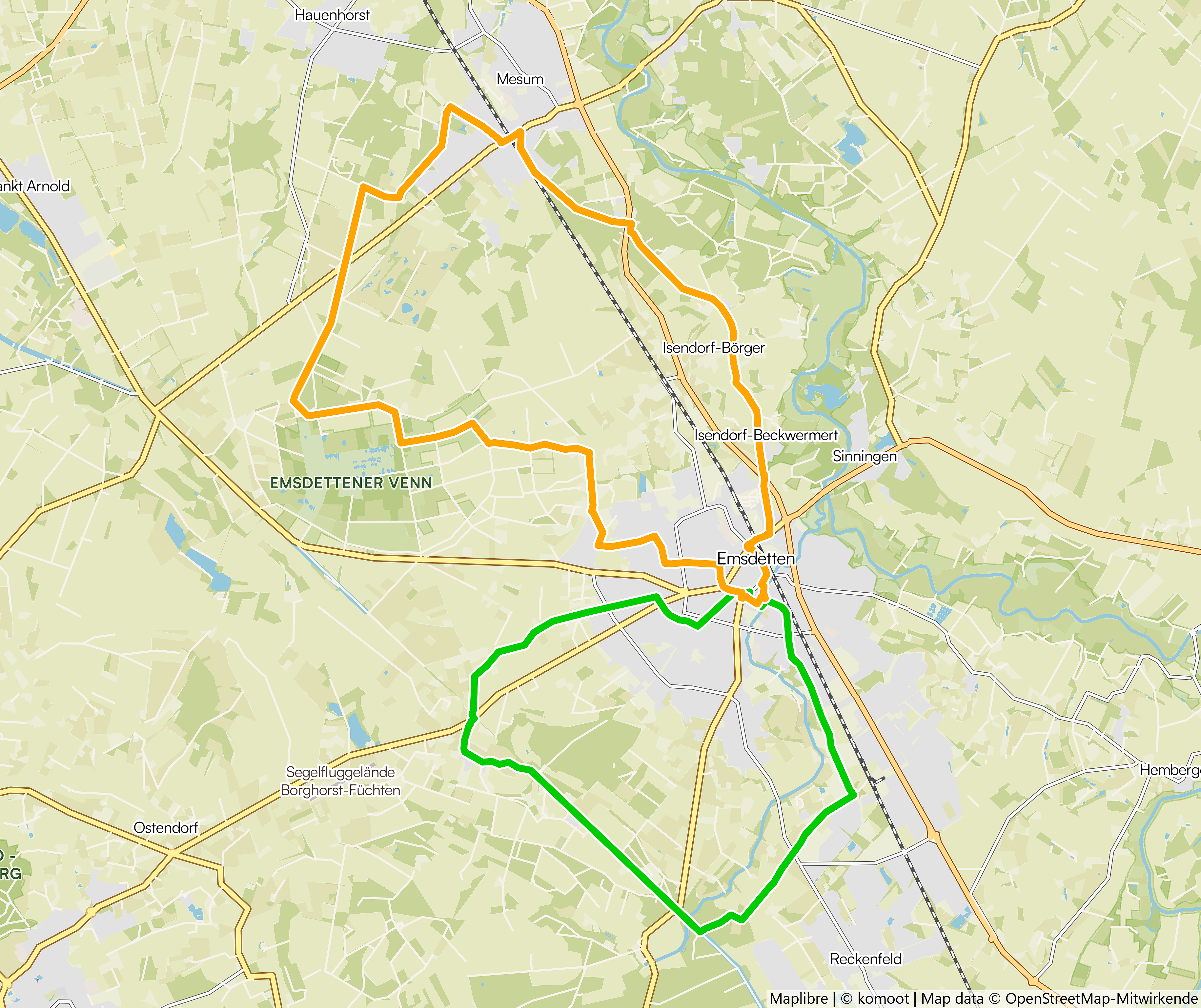Die Emsdettener Acht auf Papier: Zwei familienfreundliche Runden bilden die namensgebende „Acht“. (Karte: Maplibre komoot OpenStreetMap Mitwirkende)